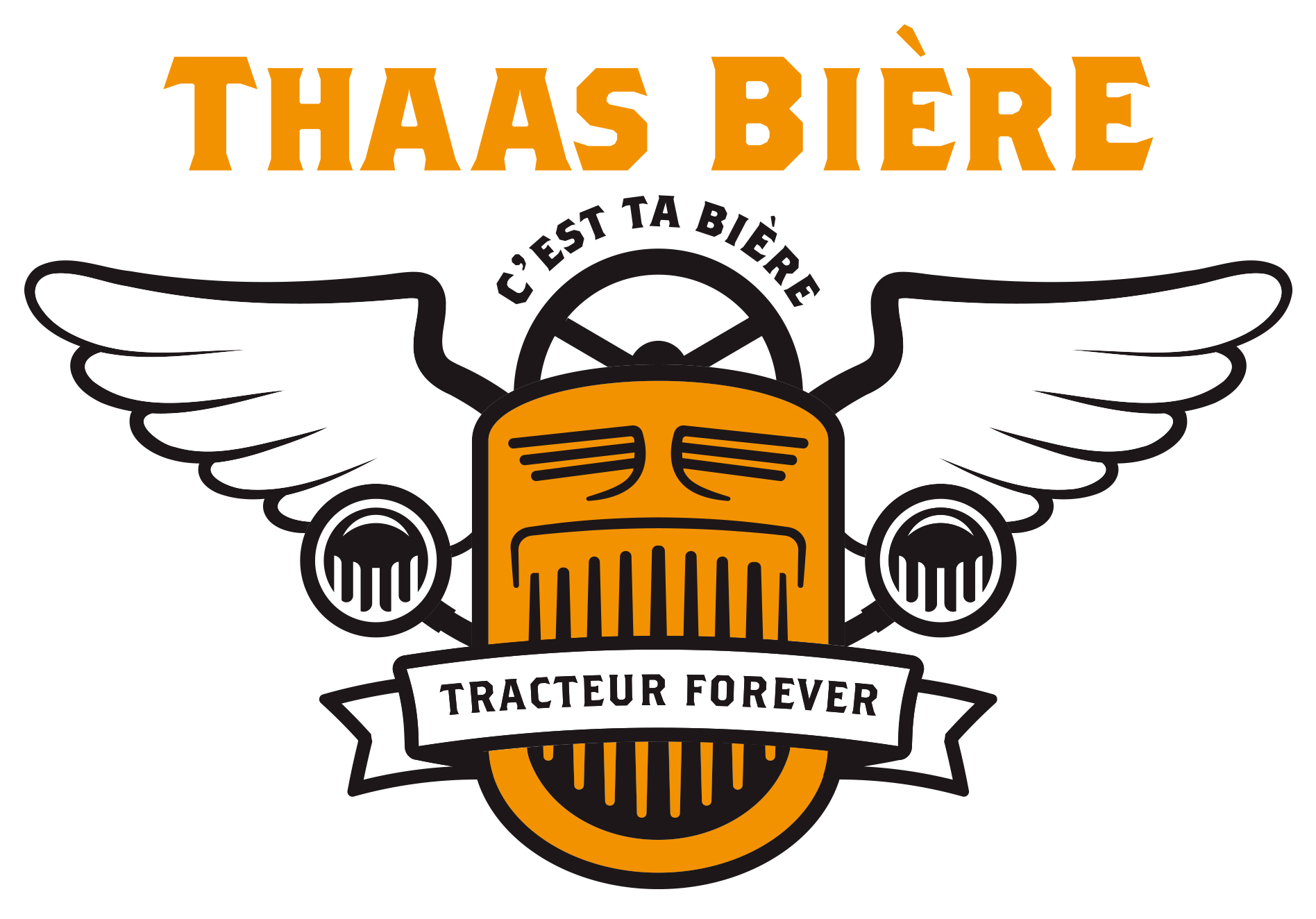 Pour le logo et l’habillage, le choix a été fait de reprendre les codes du monde des bikers appréciés par Manu mais de les détourner pour mettre en valeur l’agriculture et ses acteurs. Le logo représente la calandre d’un tracteur accompagnée de son listel sur lequel il est possible de lire la devise de THAAS BIÈRE : “tracteur forever”. Nous avons bien sûr reconnu ici l’humour de nos 2 frères et leur amour de la rime.